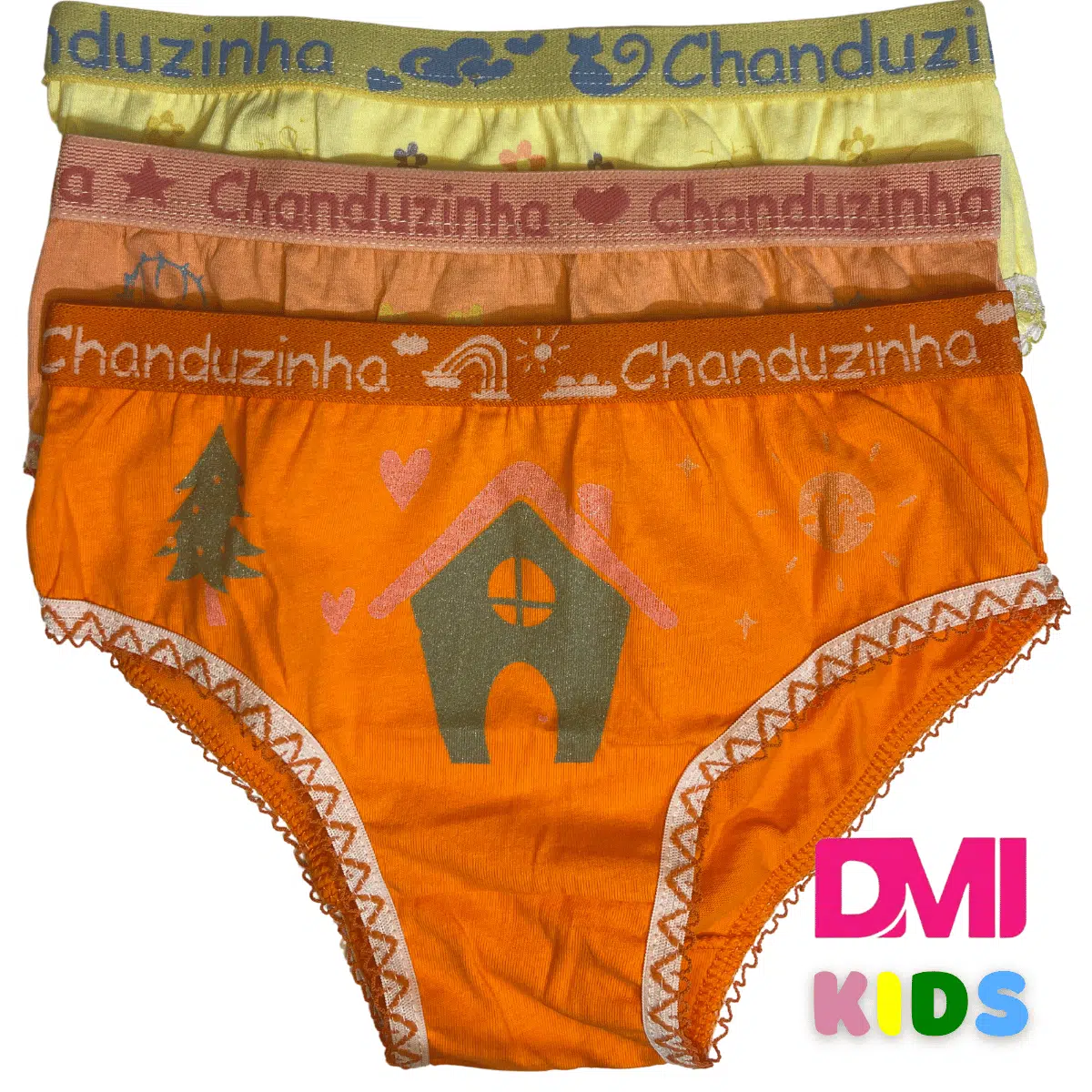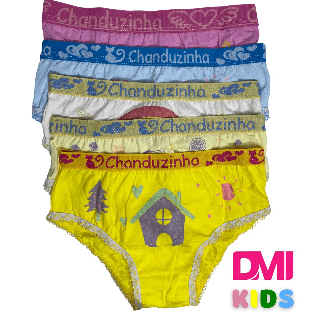 Este é um conjunto de Calcinhas Chanduzinha infantis, vendidas em pacotes com 12 unidades, apresentando cores e estampas variadas