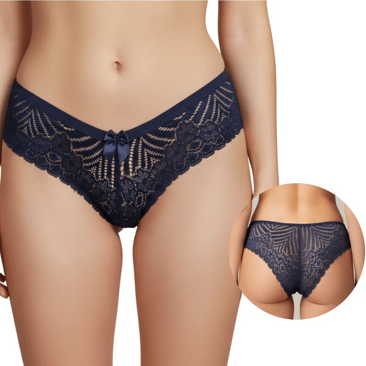 A calcinha em renda azul-marinho combina sofisticação e conforto em um design delicado e elegante. Confeccionada em renda floral de alta qualidade, possui transparência sutil que valoriza as curvas com charme e feminilidade. O laço frontal adiciona um toque romântico, enquanto o corte anatômico garante perfeito ajuste ao corpo. Ideal para compor conjuntos refinados ou ser usada no dia a dia com elegância. Uma peça que une estilo, conforto e sensualidade na medida certa.