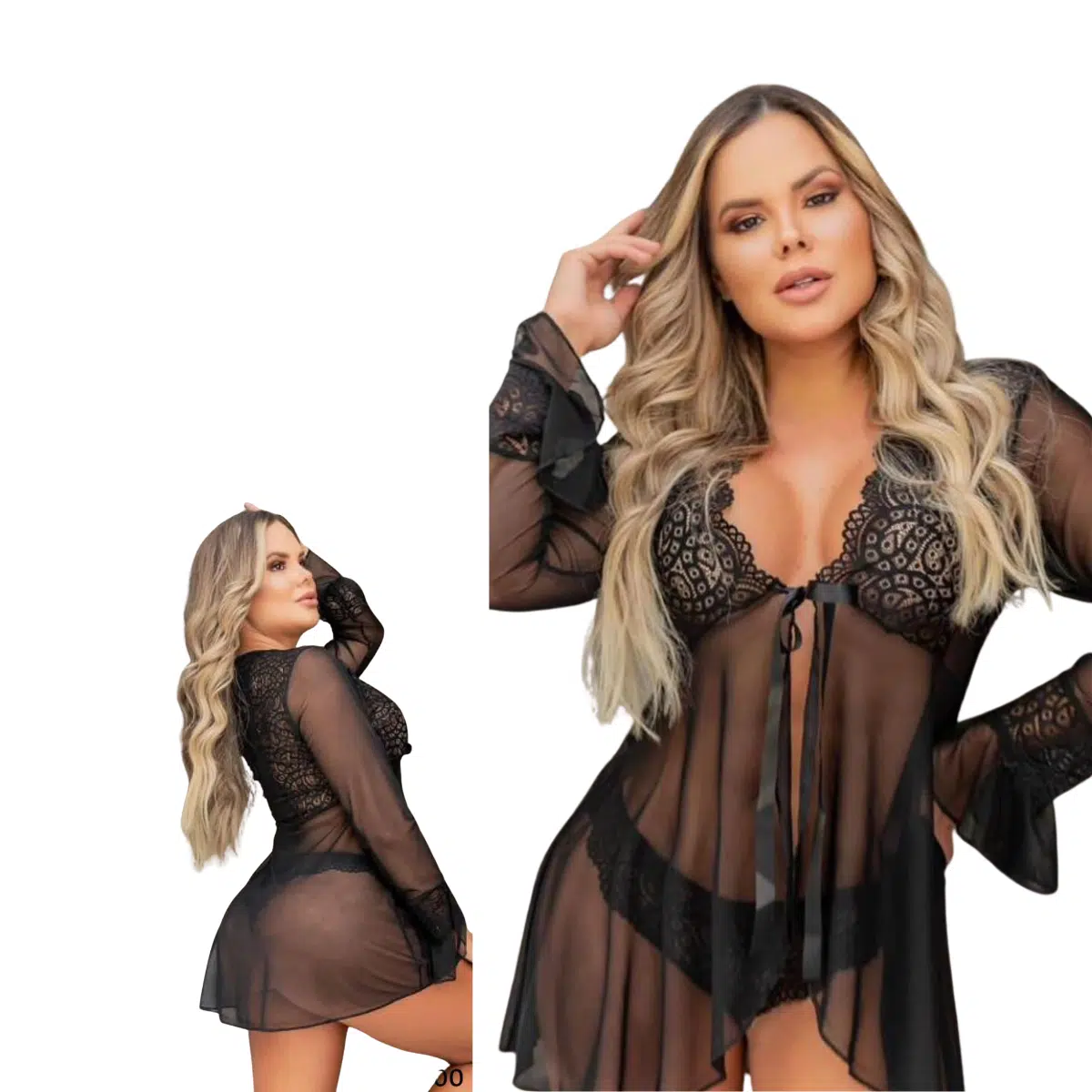 O babydoll em tule é a combinação perfeita de elegância e sensualidade. Seu design com transparência delicada e renda detalhada valoriza as curvas com charme e sofisticação. As mangas longas com acabamento fluido adicionam um toque romântico ao visual. O laço frontal completa a peça com um detalhe sutil e encantador. Ideal para quem busca leveza, conforto e um visual marcante em noites especiais.